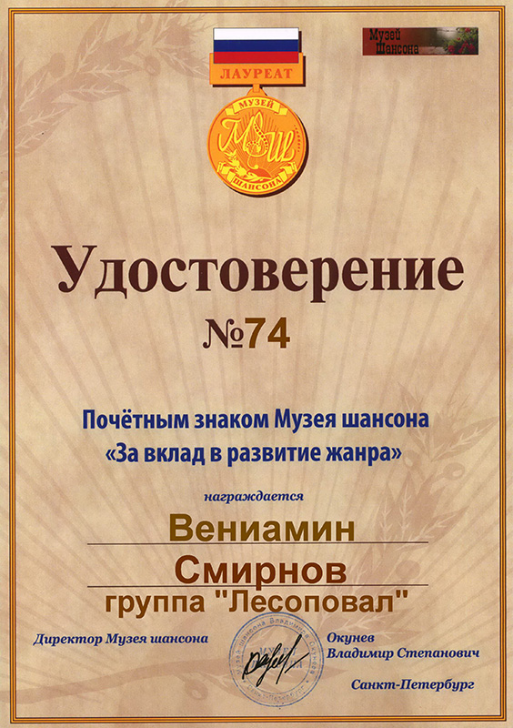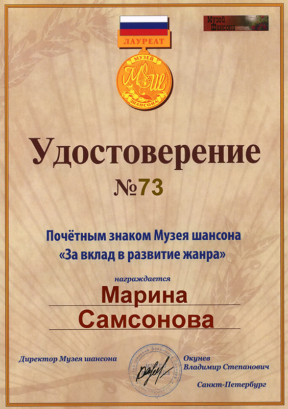 НаградыПочётный знак Музея шансона «За вклад в развитие жанра»